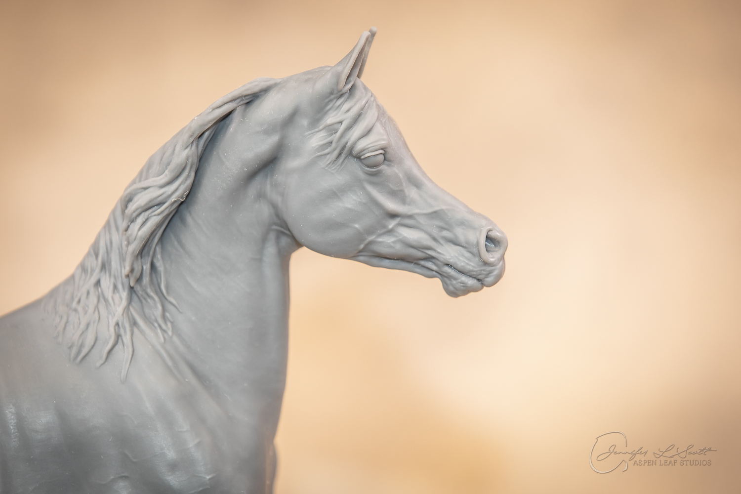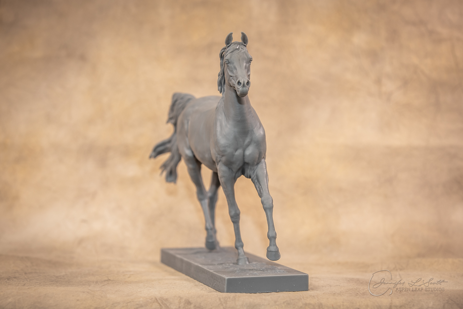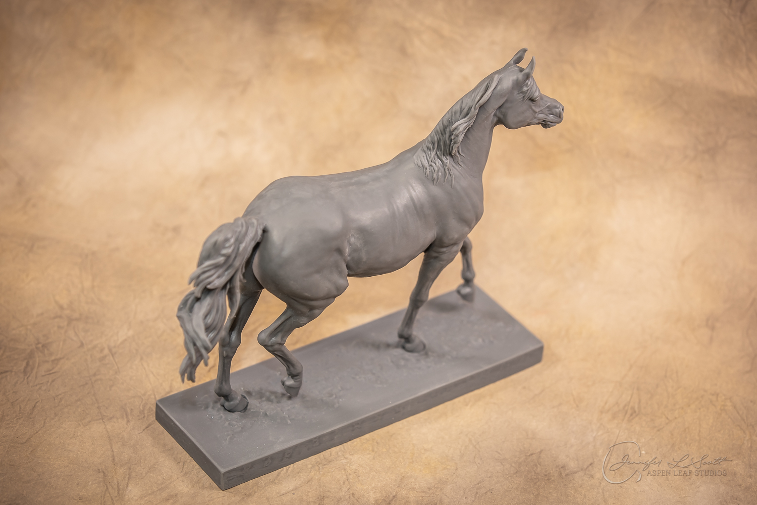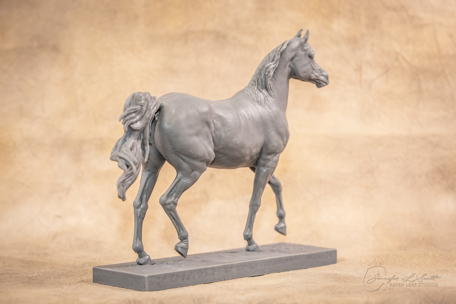 Talib (pronounced Tah-LEEB) is a plucky little (14 something hands high) representation of the Arabian. This sweet gelding is half-heartedly jigging /stepping towards something that's caught his attention. Perhaps his human has come to visit with treats? Because hims cute after all, and while clearly of good breeding this one is very much a pet. The most fun part of sculpting this piece was getting all that bendy Arabian movement. The nuances of gravity and weight shifts as he bends right, falling onto that inside shoulder. The step and support of the raised hip under his left hind and the drop of the opposite hip. The snakey-neck thing Arabians do. All of those shapes and details bring realism to this piece in ways that just sculpting pretty pieces can't. Then you add on that yummy texture and he's something that breathes. I'm so pleased with how he turned out.