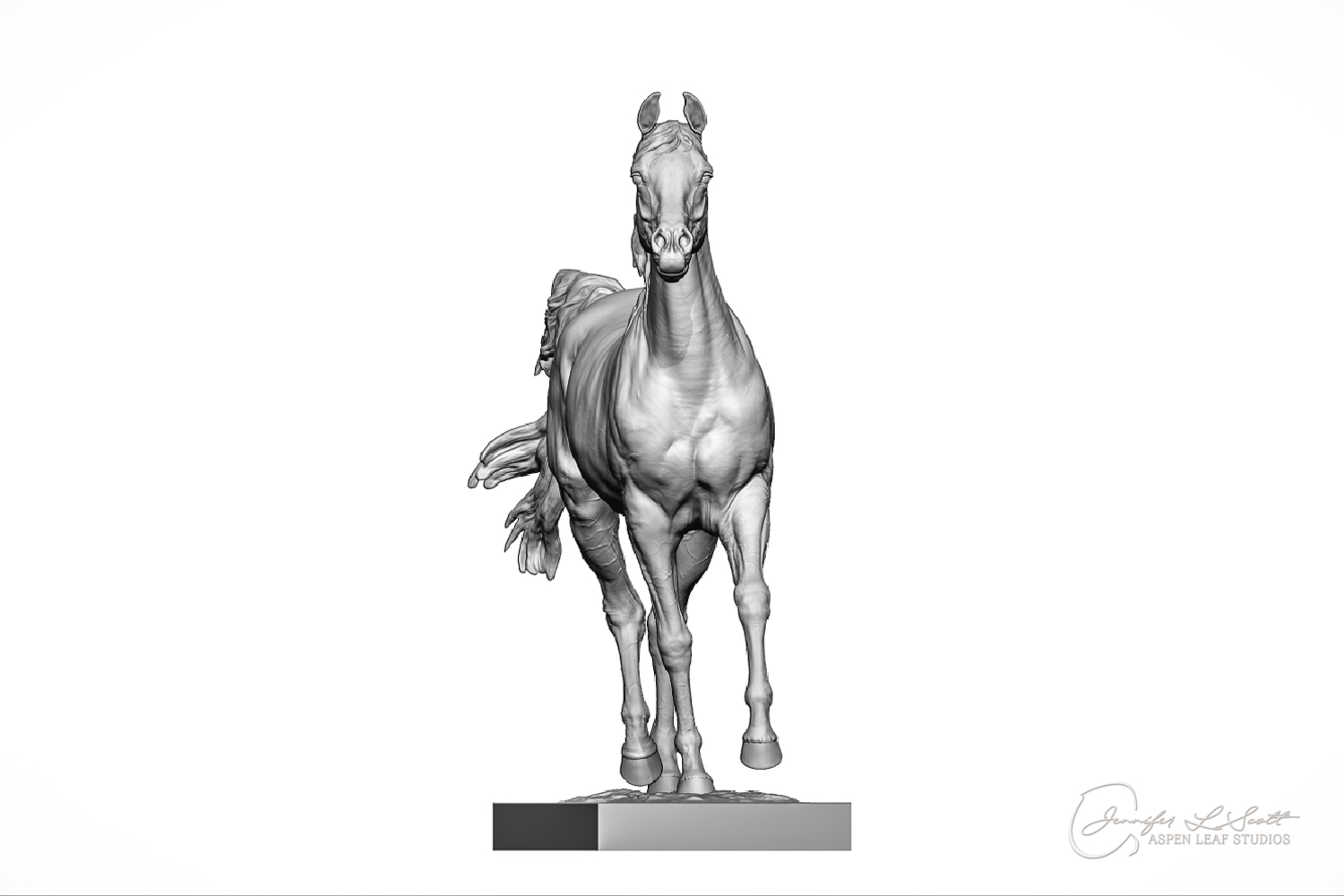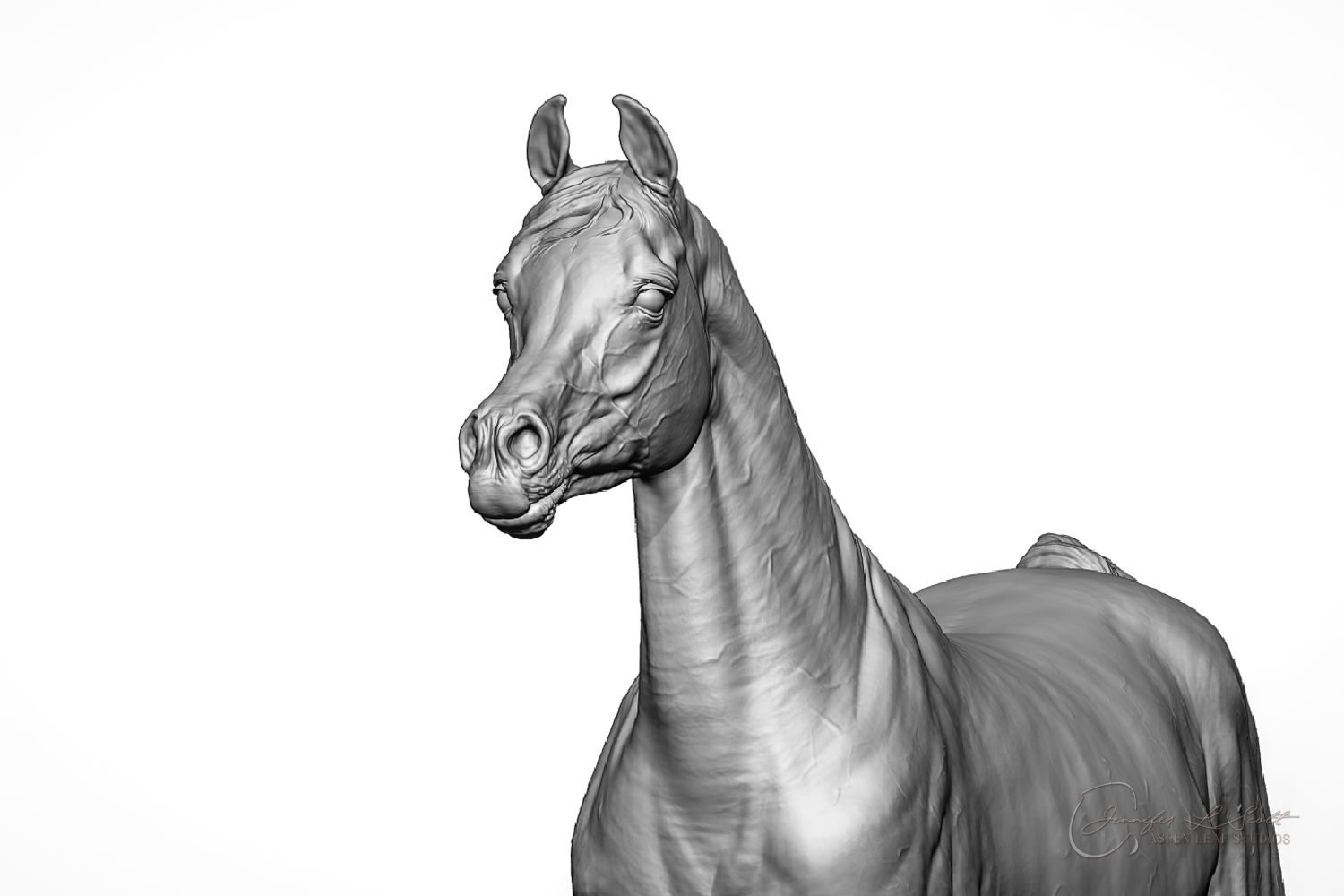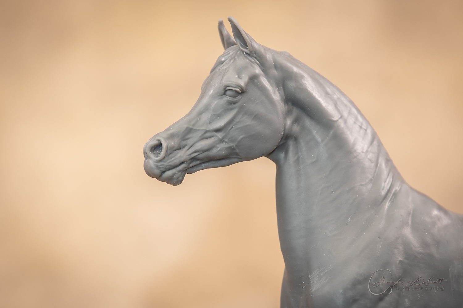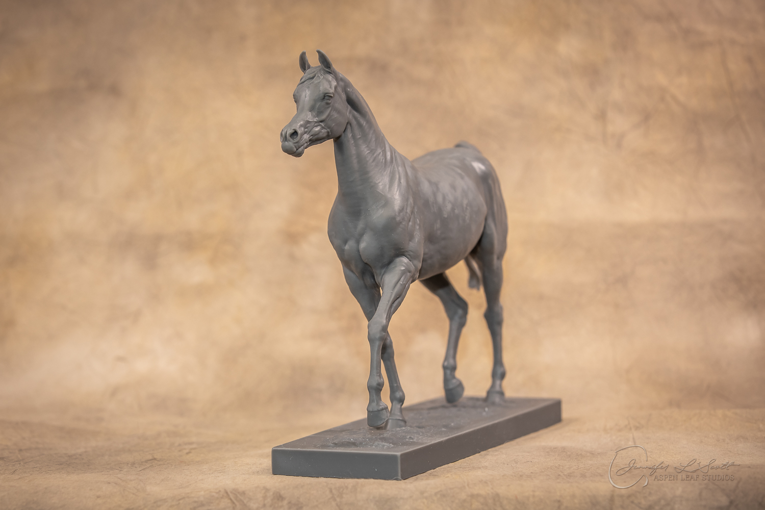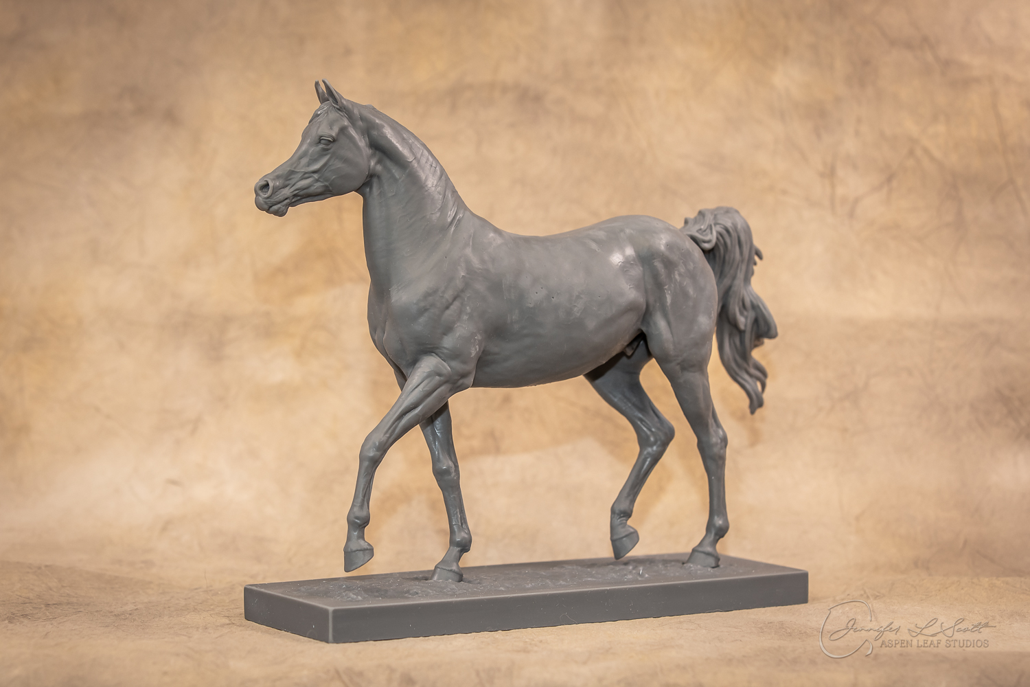 Talib (pronounced Tah-LEEB) is a plucky little (14 something hands high) representation of the Arabian. This sweet gelding is half-heartedly jigging /stepping towards something that's caught his attention. Perhaps his human has come to visit with treats? Because hims cute after all, and while clearly of good breeding this one is very much a pet. The most fun part of sculpting this piece was getting all that bendy Arabian movement. The nuances of gravity and weight shifts as he bends right, falling onto that inside shoulder. The step and support of the raised hip under his left hind and the drop of the opposite hip. The snakey-neck thing Arabians do. All of those shapes and details bring realism to this piece in ways that just sculpting pretty pieces can't. Then you add on that yummy texture and he's something that breathes. I'm so pleased with how he turned out.